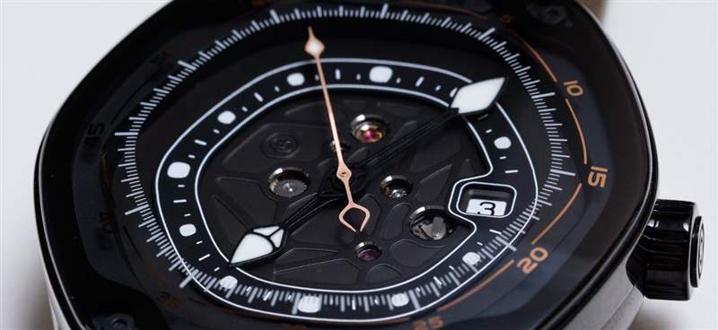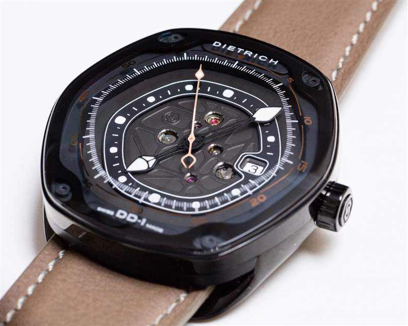 回到表盤的設計,我覺得Dietrich 將機芯的半鏤空視圖與他獨特的設計風格融合在一起真是太酷了。要做到這一點,他不僅需要研究機芯以決定顯示哪些特征有意義(例如紅寶石、水鉆和一些小齒輪),而且還需要研究如何以一種不會使表盤結束的方式來顯示變得忙碌而混亂(我們可以在無數其他手表上找到)。毫無疑問,那些欣賞精致細節和設計努力的人會喜歡定期查看像 DD-1 這樣的表盤。