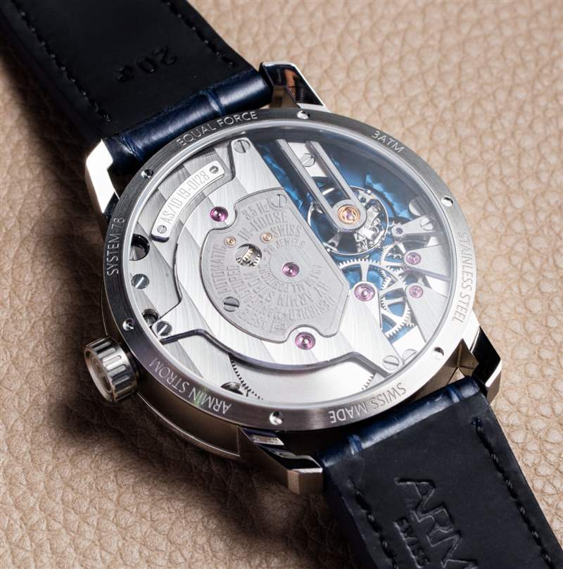 在手腕上,Gravity Equal Force 手表比許多其他 Armin Strom 手表要小得多,只有 41 毫米寬和 12.6 毫米厚。這款手表以鋼制成,但該品牌也可以很高興地用其他材料生產(chǎn)它。表殼防水深度達(dá) 30 米,雙面藍(lán)寶石水晶。請(qǐng)注意外殼底部的殘留“唇緣”。在其他 Armin Strom 手表上,這塊更大,最初的設(shè)計(jì)是為了讓 Armin Strom 可以在那里刻上所有者的姓名首字母。通過(guò)一些調(diào)整(很容易做到),Gravity Equal Force 手表可能會(huì)成為 Armin Strom 的另一大熱門。