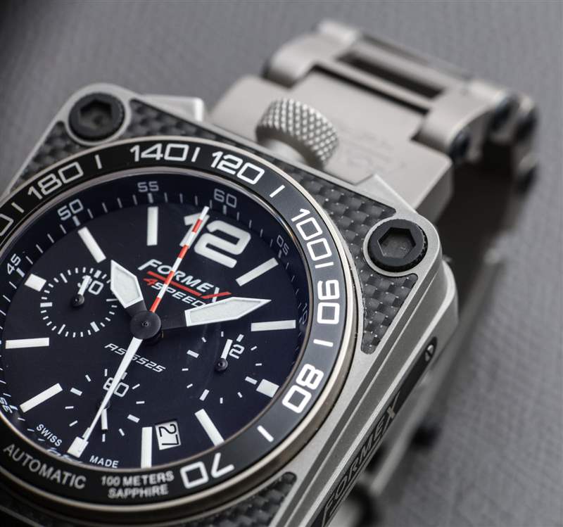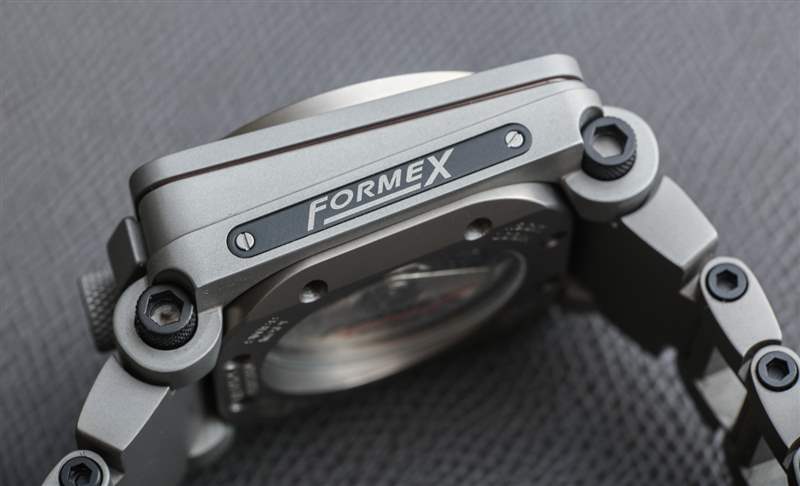 欣賞 Formex 當(dāng)時(shí)所做的獨(dú)特性的一個(gè)好方法是查看 4Speed 手鏈。與手表的其他部分一樣,它采用深灰色鈦金屬噴砂處理(當(dāng)然,與表殼相匹配)。手鐲的設(shè)計(jì)輕巧但非常耐用——而且它看起來(lái)很重要。鈦金屬結(jié)構(gòu)和鏤空鏈節(jié)營(yíng)造出有趣而實(shí)用的外觀,而鏈節(jié)、表耳和表圈上明顯超大號(hào)的黑色六角螺絲則賦予腕表一種嚴(yán)肅的力量感。最后,手鐲有一個(gè)折疊的展開(kāi)式表扣,帶有一個(gè)實(shí)際的表扣鎖開(kāi)關(guān)。這并不完全是獨(dú)一無(wú)二的,但很少見(jiàn),F(xiàn)ormex 做得很好。Formex 為 4Speed RS 6525 腕表配備了一系列賽車(chē)風(fēng)格的表帶,但搭配如此獨(dú)特的表鏈,讓人難以錯(cuò)過(guò)。