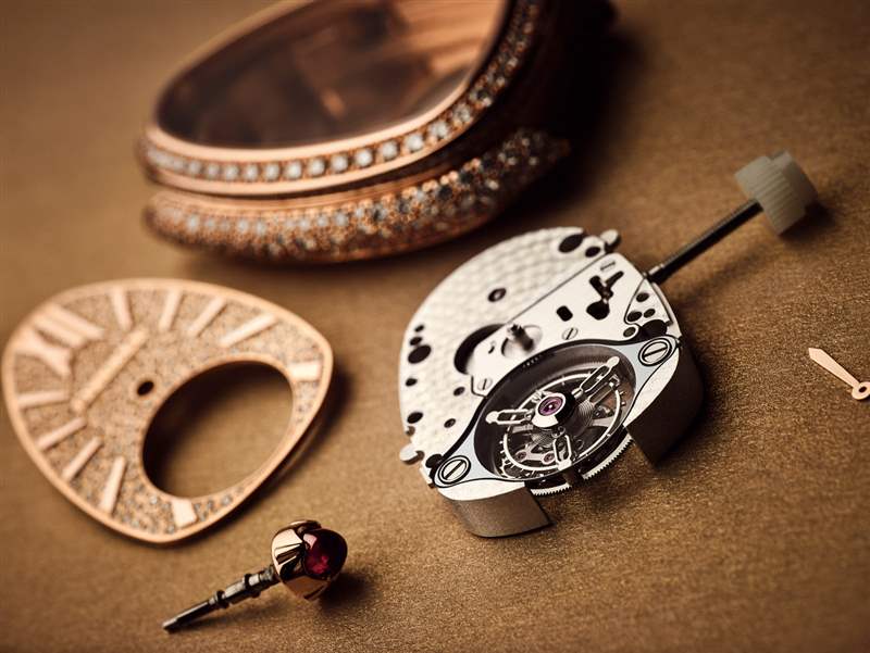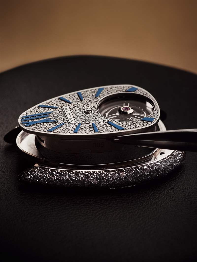 Serpenti Seduttori Tourbillon 腕表內(nèi)部的機(jī)芯是全新的 Bvlgari 自制 BVL150 機(jī)芯。除了相對(duì)較小的尺寸,BVL150 最顯著的特點(diǎn)是其造型酷似與眾不同的 Serpenti 表殼本身。手動(dòng)上鏈機(jī)芯以 3 赫茲(21,600 次/小時(shí))的頻率運(yùn)行,具有 40 小時(shí)的動(dòng)力儲(chǔ)存,小時(shí)和分鐘顯示,旋轉(zhuǎn)陀飛輪框架兼作秒針。陀飛輪本身使用藍(lán)寶石水晶頂橋,在其他方面看起來(lái)與其他寶格麗手表(如Octo Finissimo 陀飛輪)中的陀飛輪相似(盡管形狀略有不同)。機(jī)芯長(zhǎng) 22 毫米,寬 18 毫米,厚度僅為 3.65 毫米。