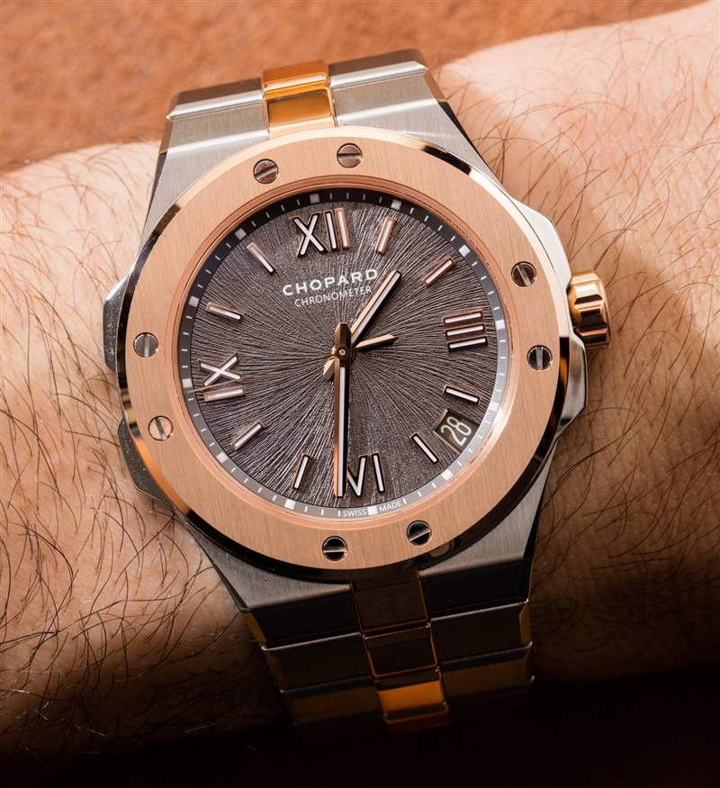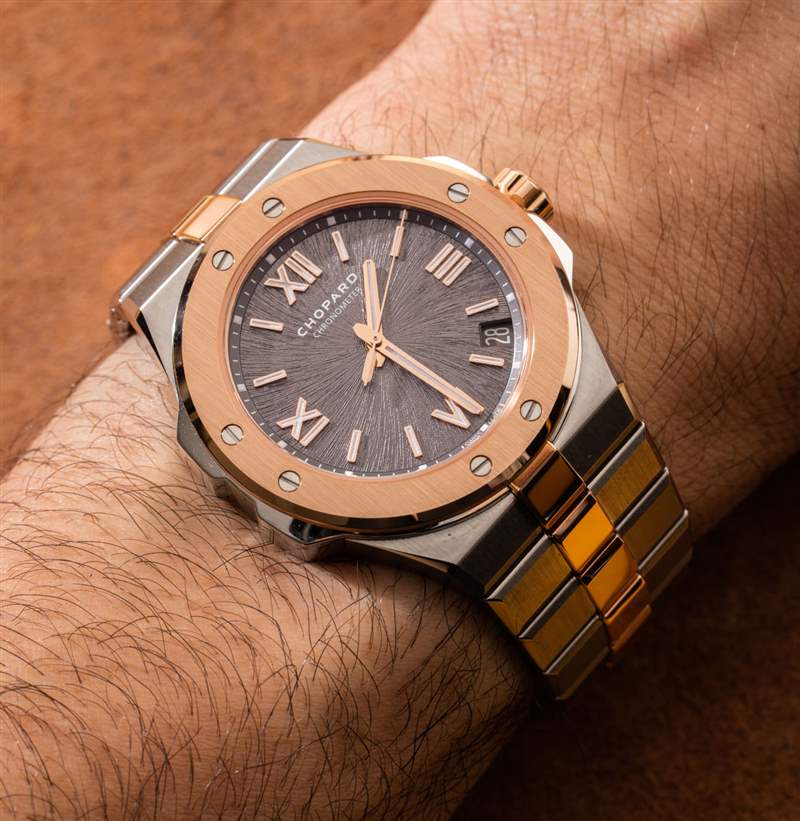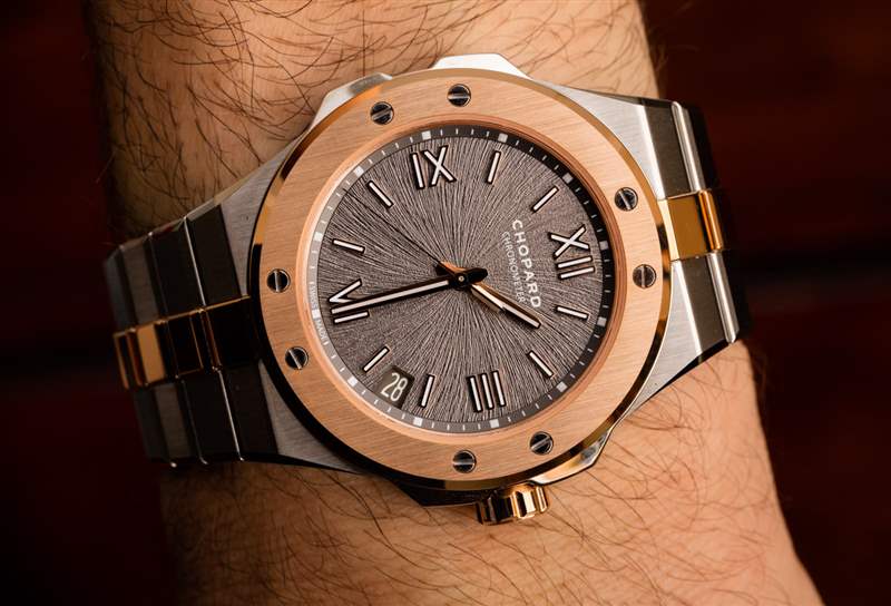 41 毫米寬的表殼(也可提供 36 毫米寬的女性型號)是一個很好的通用尺寸,表殼厚度也設法低于 10 毫米(防水 100 米),從而實現纖薄手腕輪廓。我會說表圈(這里是 18k 玫瑰金)看起來有點像刮擦磁鐵(特別是由于拉絲處理)。從美學上講,它看起來很華麗,但我不禁覺得蕭邦可能會考慮為一些未來的 Alpine Eagle 型號的表圈考慮防刮金屬合金、陶瓷或其他材料。
