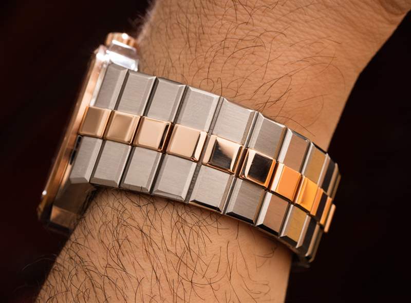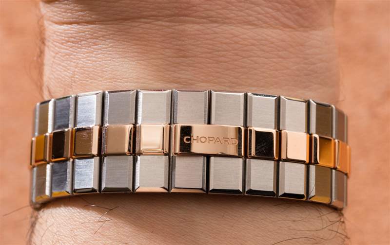 Alpine Eagle 的另一件美麗之處是手鐲。它的視覺設計并不符合每個人的口味,但嚴格的公差和整體工程確實令人印象深刻。不幸的是,這一切都是從最初的 St. Moritz 手表開始的,但對于 Alpine Eagle,Chopard 確實將手鏈投入到類固醇和超速運轉中,以打造一款外觀精美且制作精良的珠寶式手鏈。這可能是我最喜歡的手表部分。手鏈以“神秘”的隱藏展開式表扣優雅閉合。然而,如果能看到微調功能或類似系統,除了方便之外,還能幫助蕭邦在競爭中擁有更多的功能優勢,那就太好了。
