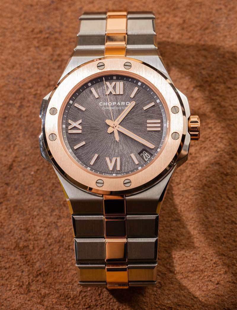 男裝 Alpine Eagle 系列的發布系列(目前女裝款式的數量遠遠超過男裝款式)只有三個款式。一種是帶有藍色表盤的全鋼材質(可以預測,這是真的,但仍然是一種有效的調色板),然后是相同的型號,但帶有灰色表盤(例如這款雙色調型號)。
