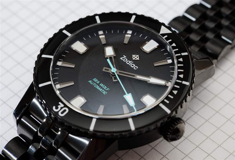 Zodiac 使用發光體和表盤顏色來創建有利于易讀性的高對比度區域。在這方面,Super Sea Wolf 53 Black 的易讀性非常高,但令我有些困擾的是,主要的 12、3、6 和 9 點鐘時標比其他時標大得多。這只是弄亂了面部的整體對稱性和平衡,這種涂黑的 Super Sea Wolf 53 Black 與其他具有相同表盤設計的 Super Sea Wolf 53 非黑色手表的對比更加強調了這一點(保存為不同的顏色)。