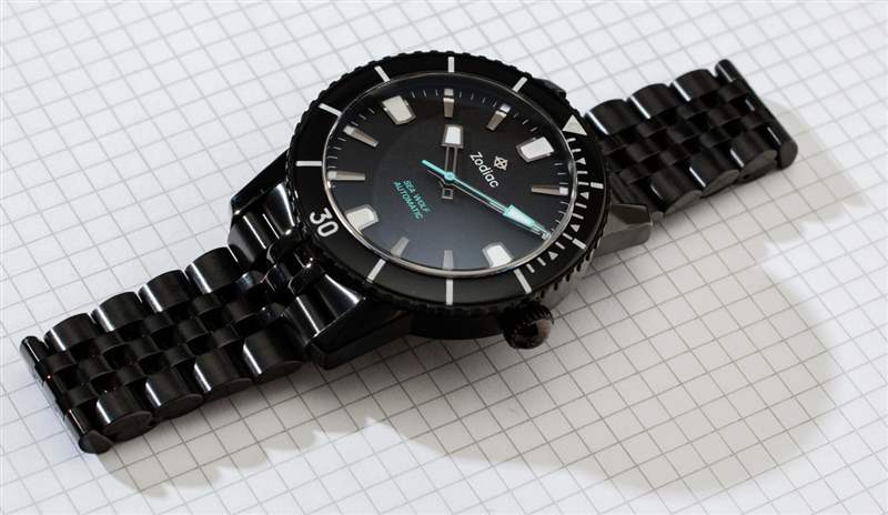 對比度很有趣,因為雖然它可以在幾乎所有情況下幫助易讀性,但太多的對比度會導致強烈的對比色……這會導致整體優雅的侵蝕。在 Super Sea Wolf 53 Black 上特別好用的是黑色 40 毫米寬的表殼和配套的表鏈。至少可以說,很難找到這樣的黑色手鏈,因為手鏈的每一塊都應該單獨涂層。我不確定 Zodiac 使用了什么工藝(因為這款手表的售價僅比非黑色款高一點),但鋼表鏈上的黑色涂層非常均勻,有助于為這款表鏈設計注入新的活力。廣告訊息廣告信息結束