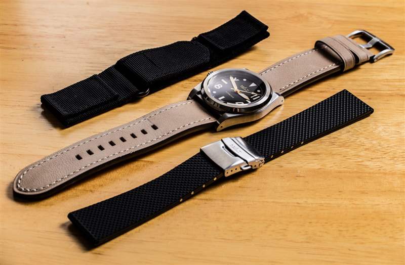 表殼內是瑞士 ETA 2824-2 自動機芯,以 4Hz 運行,動力儲存約兩天。對于這種風格和價位的手表來說,這是一款合適的機芯。我喜歡表盤缺少日期窗口的方式,因為這有助于保持美觀和表盤對稱。MAT 的肩帶很慷慨,而且還碰巧提供了一些我最喜歡的第三方肩帶。California XL 手表提供三種表帶選項,但實際上我一直將它佩戴在同樣來自 MAT 的藍色紋理表帶上。在風格方面,我喜歡 42.5 毫米寬的表殼和 24 毫米寬的表帶的組合,因為它有助于進一步體現 California XL 手表所追求的大膽“XL”主題。MAT California XL 手表的包裝中包含一條棕褐色皮革表帶、一條黑色橡膠表帶和折疊展開式表扣,以及帶有魔術貼連接系統的古怪黑色紋理表帶。后一種表帶是手表的有趣但小眾選擇,在隨附的表帶中,棕褐色皮革表帶很容易成為我的最愛。