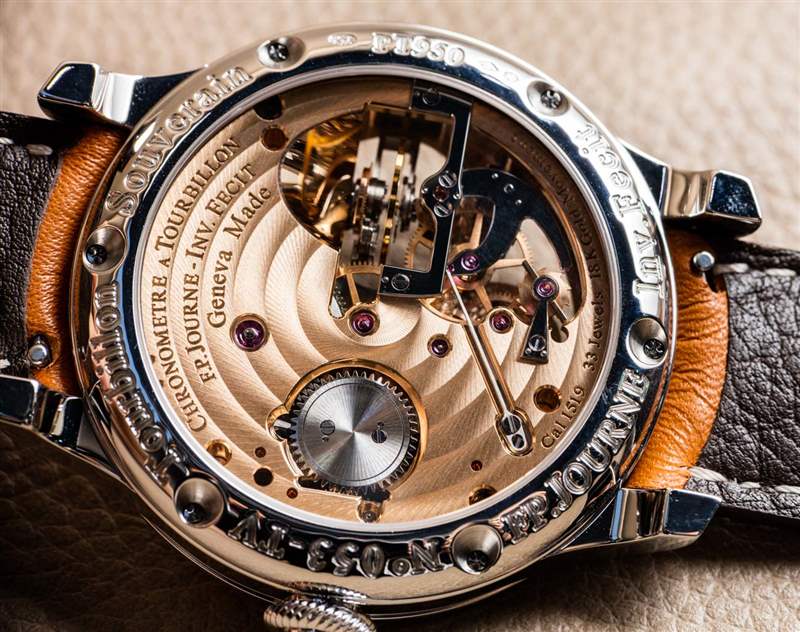為什么沒有更多的垂直陀飛輪?它實際上不是 FP Journe 的發明,而且我所知道的大多數垂直陀飛輪都在 Hublot 時計上——盡管這些手表中的大多數都沒有這款 Tourbillon Souverain 那樣考究或經典優雅。FP Journe 似乎在陀飛輪展示上付出了很多努力,結果在陀飛輪機構周圍形成了一個厚實的、傾斜的鏡面拋光環和一些漂亮的橋接件。表盤上陀飛輪下方的一個打開的窗口顯示了輔助死秒針運動部件的一些視圖。看到旋轉的陀飛輪與“滴答”的無跳動秒針配對非常整潔。廣告訊息廣告信息結束