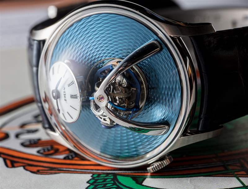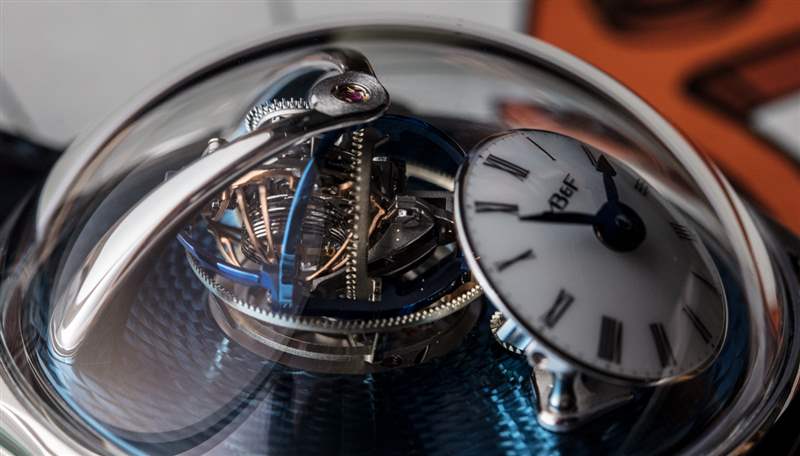 Thunderdome 內(nèi)部的手動上鏈機械機芯既復(fù)雜又涼爽。波特式調(diào)節(jié)系統(tǒng)由 413 個零件制成,以 3Hz 的頻率運行,該機構(gòu)在三個主發(fā)條盒之間具有 45 小時的動力儲存(非常耗電的機芯)。手表的表盤僅以小時和分鐘指示時間(沒有傳統(tǒng)的秒指示),動力儲存指示器位于機芯上,可從表殼后部看到。該機芯的一個有趣技巧是使用齒輪裝置來操作手表表面的時間傾斜表盤。