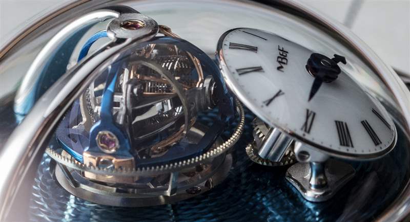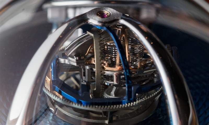 考慮到 TriAx 系統(tǒng)中所有部件的轉(zhuǎn)動速度有多快,這需要仔細(xì)檢查——你可以看到最里面的元件每 8 秒轉(zhuǎn)動一次,藍(lán)色的中間部分(我相信大部分 TriAx 是由鈦制成的)每 12 秒轉(zhuǎn)動一次, 最外面的籠子每 20 秒旋轉(zhuǎn)一次。TriAx 是一款非常迷人的小型鐘表陀螺,令人著迷。MB&F 未來可以通過在顯著的圓頂藍(lán)寶石水晶上開發(fā)更好的抗反射涂層來進(jìn)一步改進(jìn) Thunderdome,從而提高這種非常易于觀看的手表機制的可見度。