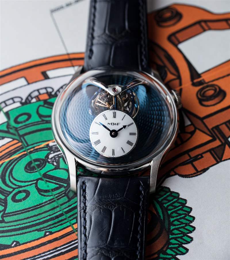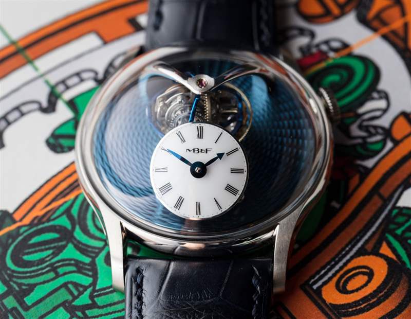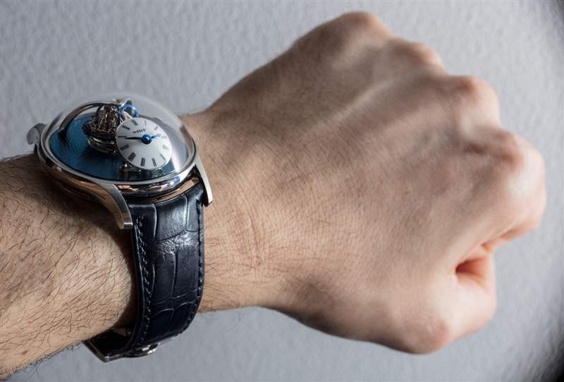 MB&F Legacy Machine Thunderdome 鉑金寬 44 毫米,體積大但非常耐磨。最大的視覺重量來自陡峭的圓頂外殼。那些對其可穿戴性持懷疑態(tài)度的人只需咨詢 MB&F 其他“高大”手表的許多滿意客戶即可。