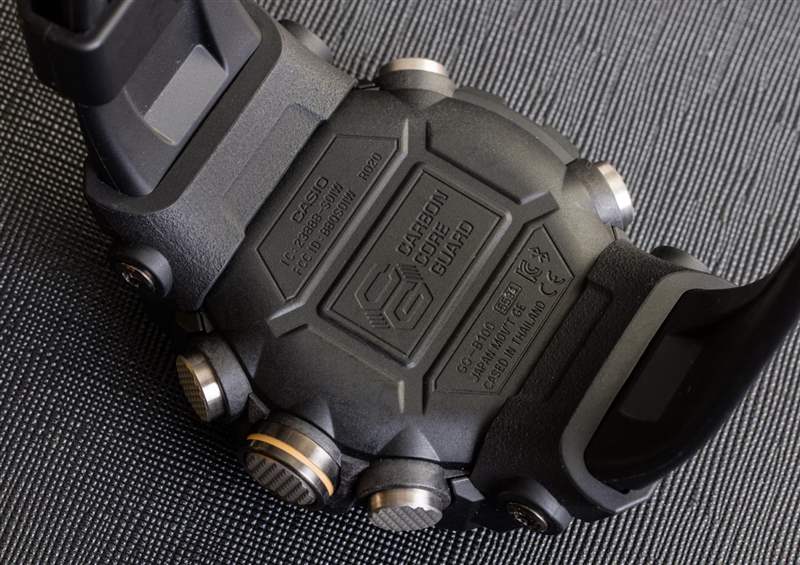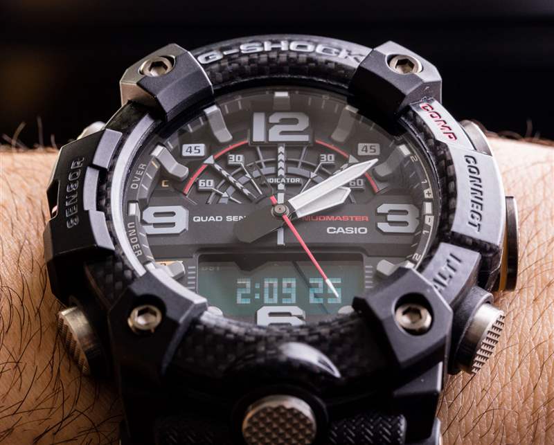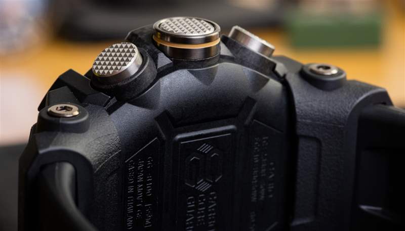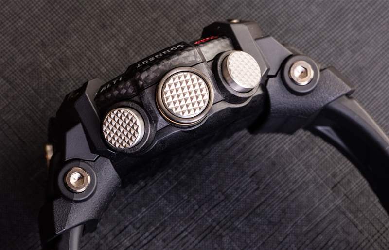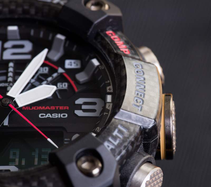 Mudmaster GG-B100 使用玻璃纖維和其他碳材料,重量驚人(55 毫米寬的手表為 92 克),而且結構非常堅固。也太舒服了吧 卡西歐將這一新概念稱為其“Carbon Core Guard”表殼結構。表盤上方是礦物水晶,表殼防水深度達 200 米。從美學上講,大多數情況下黑色碳纖維的外觀(多虧了擋板)非常華麗。卡西歐并沒有直截了當地將其稱為碳纖維,而是將表圈稱為“嵌入玻璃纖維的精細樹脂結構”。卡西歐對圖案和紋理越來越滿意,這有助于其產品看起來更好。傳統上,我認為大多數人不會將 G-Shock 稱為“漂亮”,即使它們“很酷”。今天,情況正在改變,