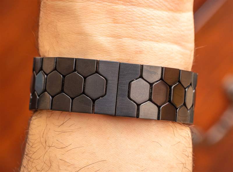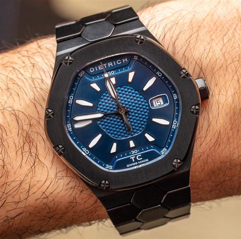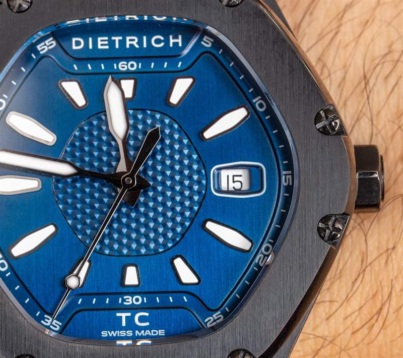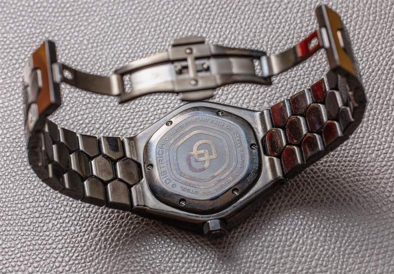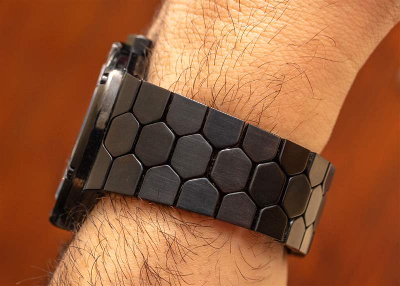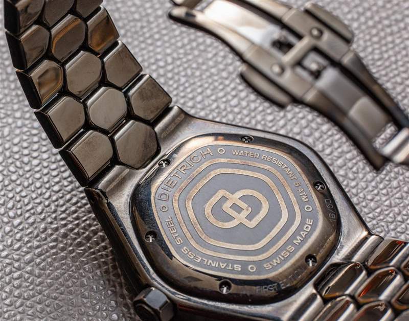 加上表冠,TC 鋼制表殼寬 46.2 毫米,沒有表冠,表殼寬 43.8 毫米,厚度僅為 9.3 毫米。考慮到與表殼的喇叭形側(cè)面相比,表耳變得狹窄,它實際上磨損了一點。在這里,我們看到迪特里希再次嘗試使用六邊形主題。這款腕表采用定制的藍寶石水晶表鏡和全鋼表殼和表鏈,重約 166 克,具??有 50 米防水深度和旋入式表冠。