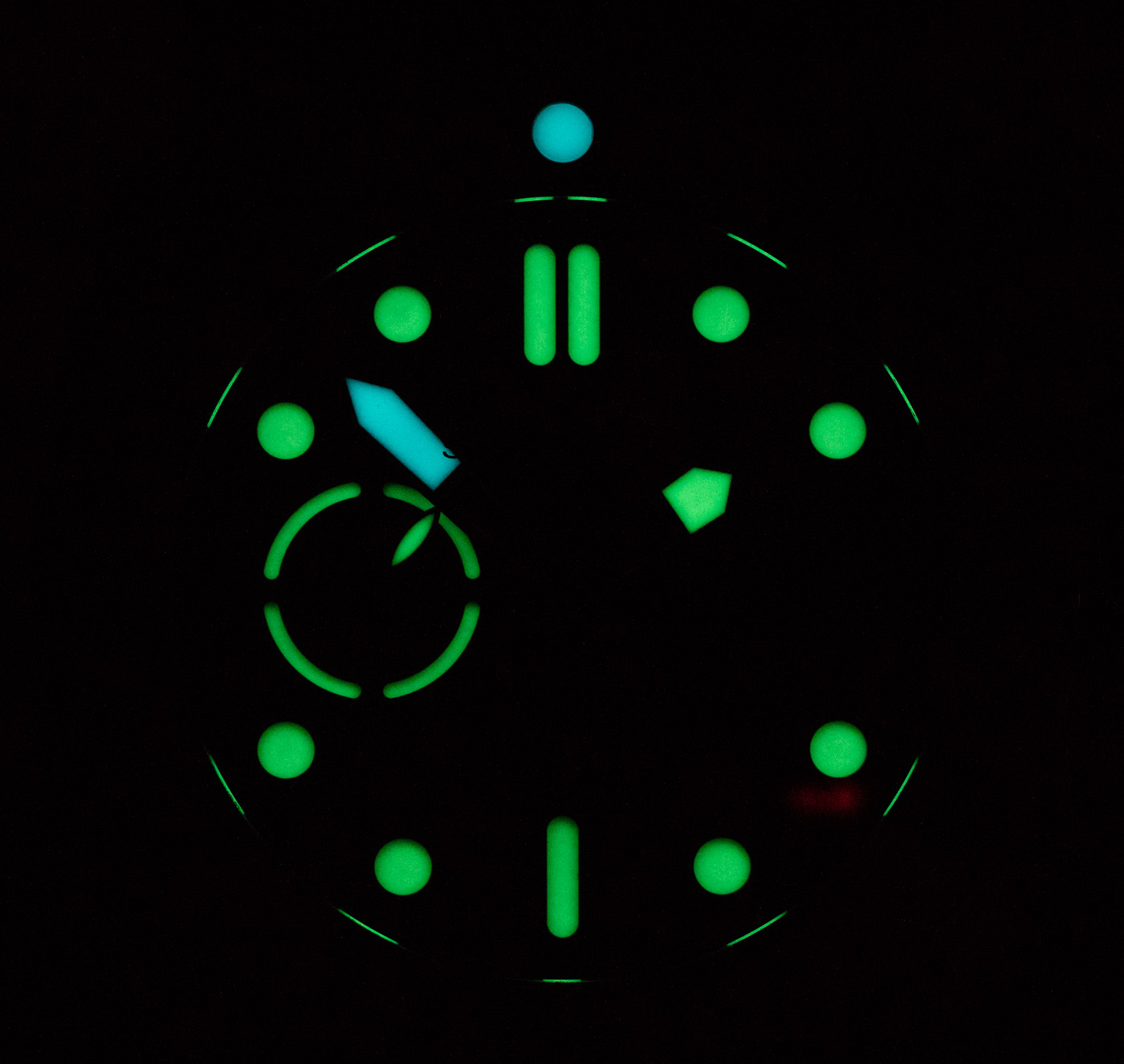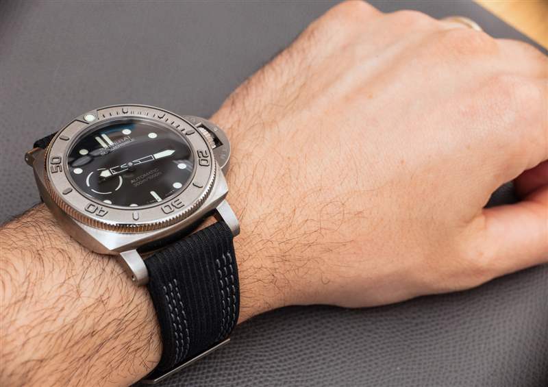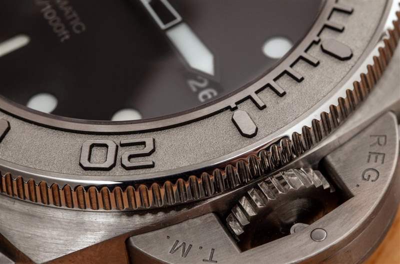 說到藍寶石水晶,沛納海決定將表盤文字移到藍寶石水晶上。因此,沛納海采用金屬化技術將沛納海標志和其他表盤文字應用到藍寶石水晶的背面。結果是文字似乎漂浮在表盤上,并具有整潔的金屬外觀。公平地說,沛納海并不是這項技術的發明者,但他們使用得相當好。有些人可能首先對水晶文字感到惱火,因為它有時看起來像指針上的表盤障礙物,但總的來說,我認為它有助于為潛水式 Mike Horn 時計設計增添個性。