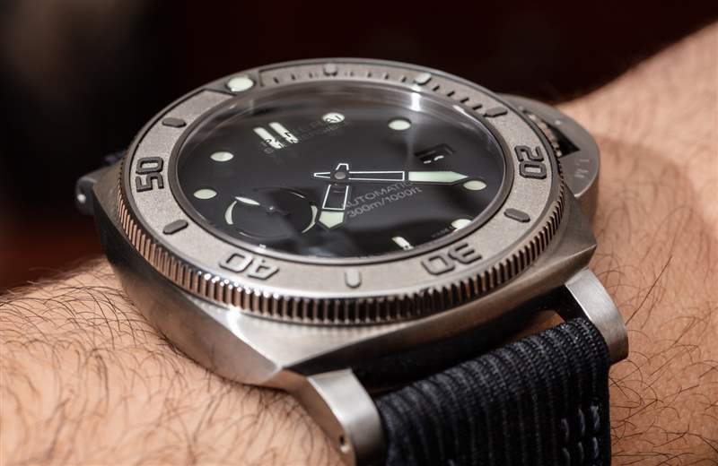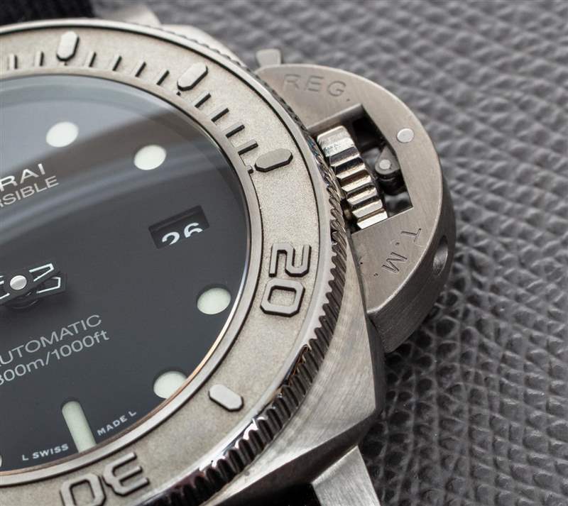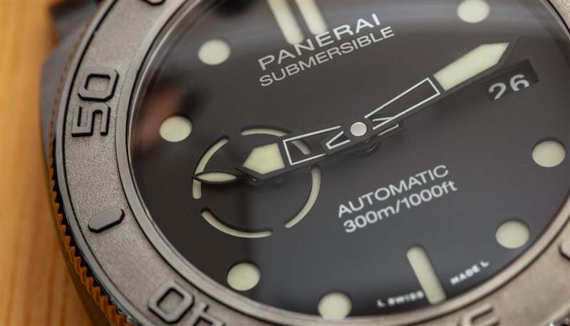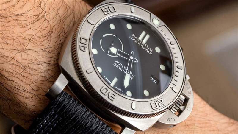 沛納海指出回收的生態鈦表殼是手表高成本的主要部分。據他們說,回收和重鑄鈦所需的工藝非常昂貴。這與許多其他“可持續”材料一致,因為它們仍然比“原始”材料更昂貴。無論如何,Eco-Titanium 仍然是鈦,它構成了精細加工的 5 級鈦潛水表殼,這里有 47 毫米寬(不包括表冠),防水 300 米,因為這是潛水員風格的潛水系列手表. 沛納海 (Panerai) 是為數不多的手表在手腕上仍然看起來不錯的少數品牌之一,鑒于其鈦表殼材料,Submersible PAM984 的所有尺寸都可預見的舒適且重量輕。表殼厚約 15 毫米,凸耳到凸耳的距離約為 56 毫米。表盤上方是一個鍍有 AR 涂層的圓頂藍寶石水晶,實際上它的圓頂比我戴過的其他沛納海手表要少一些。較少的圓頂有助于減少眩光,從而提高表盤的易讀性。