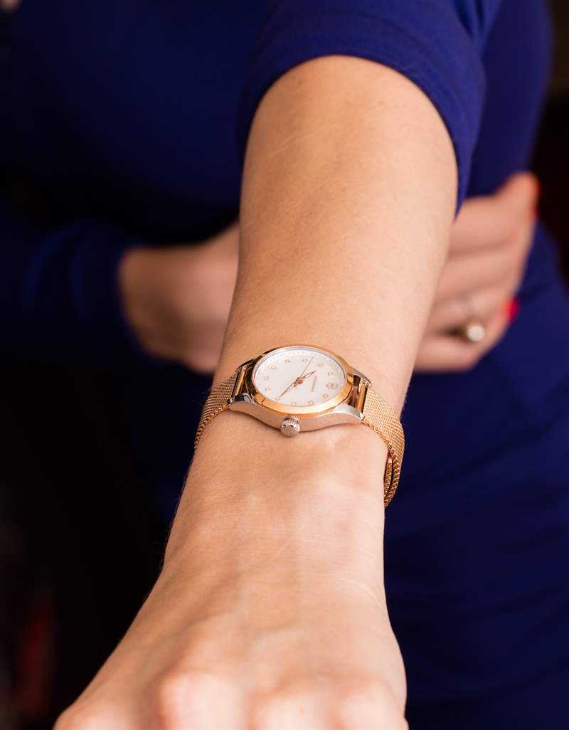 如果我以銷售員的身份坐在手表店里,想要擁護 Victorinox 這一特定系列的女士手表的優點,我可能會說這是為那些仍然希望世界發現她有吸引力的實用女性而設計的。關于這款來自傳統“工具表”制造商的 28 毫米寬閃亮女式手表,我首先注意到的一件事是每個小時刻度處的珍珠母和小施華洛世奇水晶的裝飾性裝飾。Victorinox 對漂亮的女士手表并不陌生,但很少,如果有的話,他們以前的系列會深入研究“金光閃閃”。進入似乎對年輕買家的關注感興趣的 Victorinox,以及似乎從鐘表選擇開始的女性(盡管作為一個男人,我承認沒有研究過該品牌目前可能提供的最新女性時尚或行李箱選擇)。