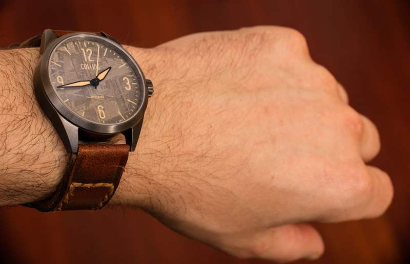 在任何時候,表盤上的指針都清晰易讀,但根據光線的不同,隕石表盤上的時標和其他印刷則不清晰。這對我來說沒什么大不了的,但是那些喜歡在所有光線條件下一直看到時標的人應該考慮一下表盤上的奶油色流明印花有時如何與表盤的外觀融為一體. 所有最初的 Hyperion 手表的時標設計都是相同的,因此對于稍微傳統易讀的表盤,您可以選擇柯林斯提供的其他產品。對我來說,Hyperion Meteorite 是柯林斯手表公司首次亮相的產品中最有趣的,它融合了熟悉的外觀、裝飾性但陽剛的表盤以及與我家鄉的愉快情感聯系。