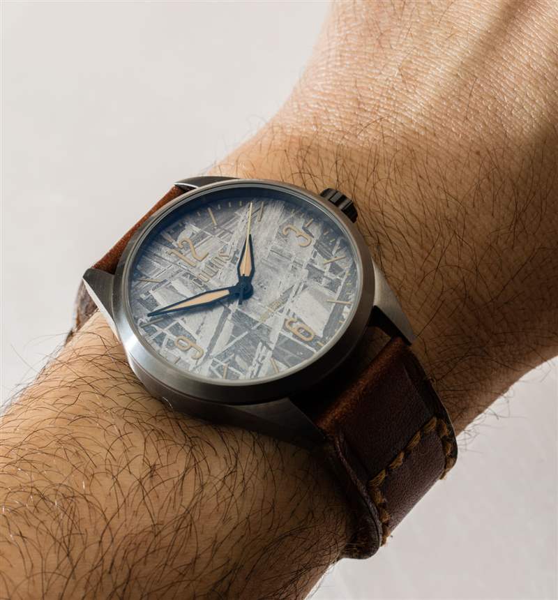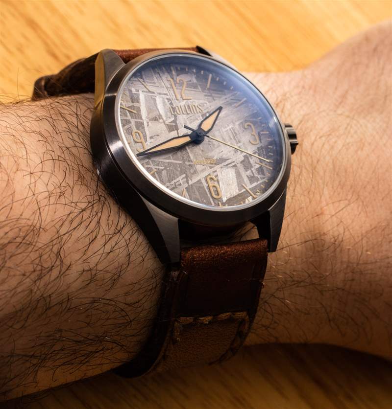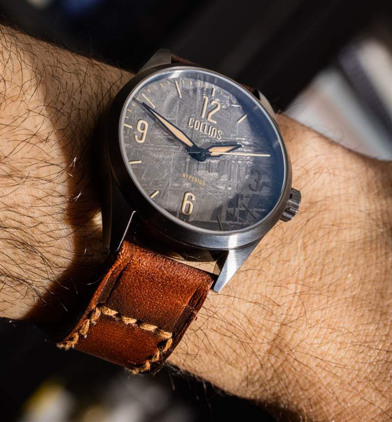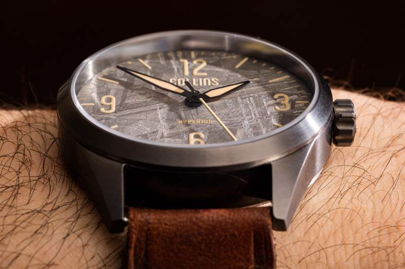 柯林斯手表公司是由鐘表愛好者企業家創辦的現代“小批量”美國手表公司的一部分——這一次總部設在我的家鄉洛杉磯。Collins Watch 創始人 Jimmy Collins 在音樂錄音行業有一份日常工作,并試圖從錄音設備中汲取一些靈感,我相信他希望在以后的手表中做更多的事情。對于他的首個鐘表系列——Hyperion——我們看到了一個設計成看起來像音量旋鈕的表冠。Hyperion 有幾種風格,本文重點介紹我特別喜歡的版本,稱為 Hyperion Meteorite。