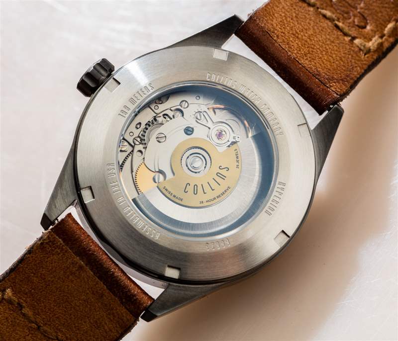對于機芯,柯林斯手表公司決定使用可靠的瑞士 Sellita SW200 自動上鏈機芯。這與瑞士 ETA 2824-2 自動變速器或多或少相同。它以 4Hz 的頻率運行,具有 38 小時的動力儲存。未完成的機芯表面實際上與底蓋的拉絲處理相匹配,因此材料至少在美學上匹配,這很好。自動轉子上是一個定制的柯林斯板,它為整體產品展示增加了一點額外的獨特性。