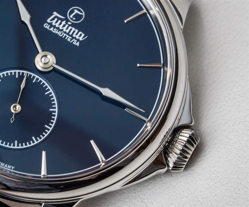 Tutima Patria Steel 吸引我的不僅是價(jià)格或質(zhì)量,還在于其風(fēng)格和個(gè)性。手表很考究,但不乏味或過于保守。雕刻的 43 毫米寬表殼具有內(nèi)置表冠保護(hù)裝置等精美元素,防水深度達(dá) 50 米。在這種現(xiàn)代尺寸下,它引人注目且大膽——這很重要,因?yàn)槿藗兣宕魇直硎菫榱吮蝗丝吹?。Tutima 顯然做了一些額外的工作來確保表盤清晰易讀。他們將藍(lán)色表盤與拋光的自制精鋼指針進(jìn)行了正確的組合,頂部經(jīng)過精心打磨的平面拋光,以幫助創(chuàng)造更多的視覺對(duì)比,而不是眩光。結(jié)果是一個(gè)美麗的鋼和藍(lán)色調(diào)色板,也可以很好地作為一個(gè)清晰的時(shí)計(jì)(德國(guó)方式……)。