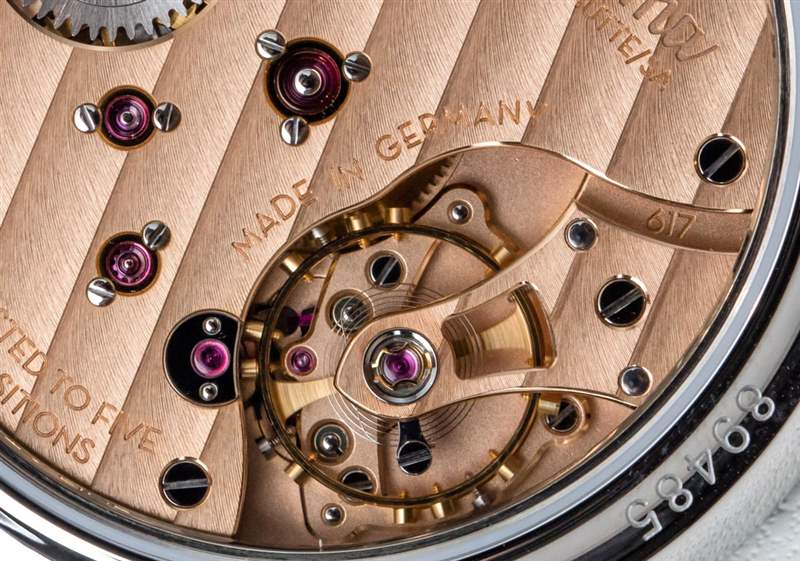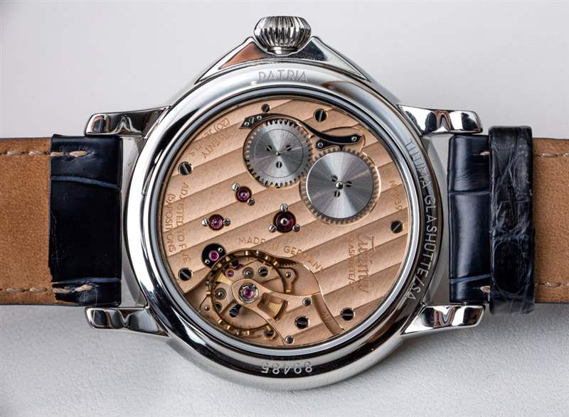 Tutima Patria 藍(lán)色海軍上將參考。6610-01(也有灰色或白色表盤版本的 Patria 鋼)基于 Patria 小秒針系列,該系列使用該品牌最簡(jiǎn)單的手動(dòng)上鏈計(jì)時(shí)機(jī)芯。Tutima 生產(chǎn)這種具有其他功能的更高級(jí)版本的機(jī)芯,例如動(dòng)力儲(chǔ)存指示器和第二時(shí)區(qū)。也就是說,您可以使用 Patria 鋼獲得真正的高級(jí)鐘表,而海軍上將藍(lán)色表盤實(shí)際上是烤琺瑯。Calibre 617 機(jī)芯非常好看,采用典型的德國(guó)風(fēng)格制造,帶有 3/4 夾板和用于固定紅寶石的金色套筒。該機(jī)芯還具有良好的手工加工水平,并且尺寸合適,因此通過手表上的藍(lán)寶石水晶底蓋可以看到表殼。機(jī)芯以 3Hz (21, 600 bph),動(dòng)力儲(chǔ)存為 65 小時(shí)。手動(dòng)上鏈機(jī)芯帶有輔助(?。┟氡P顯示時(shí)間。廣告訊息廣告信息結(jié)束