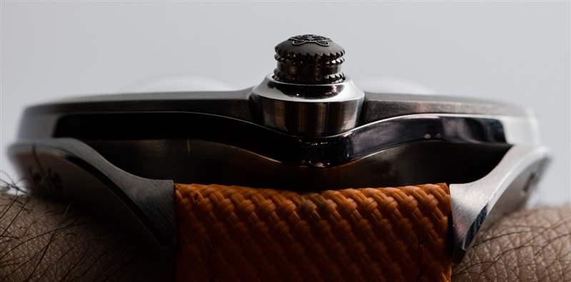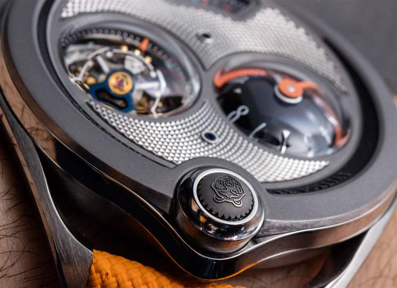 從視覺(jué)上看,DC 6 Solstice Half Hunter 看起來(lái)就像一張盯著你看的科幻臉。或者防毒面具,或者蒼蠅,或者蚊子,取決于你的觀點(diǎn)。兩個(gè)相對(duì)的表盤(pán)看起來(lái)像眼睛,上面覆蓋著高度圓頂?shù)乃{(lán)寶石水晶。臉的“嘴”實(shí)際上是表冠,這是 DC 系列手表的獨(dú)特元素之一,被 Candaux 稱(chēng)為“神奇的王冠”。DC 1 和 DC 6 系列手表沒(méi)有像我們?cè)诖蠖鄶?shù)其他手表中發(fā)現(xiàn)的那樣在表殼側(cè)面有一個(gè)固定的表冠,而是有一個(gè)表冠,當(dāng)你按下它時(shí)它就會(huì)松開(kāi)。將表冠從其“內(nèi)部位置”松開(kāi)后,即可正常拉出以設(shè)置時(shí)間。我所熟悉的唯一一款具有類(lèi)似表冠概念的時(shí)計(jì)是香奈兒 J12 逆行神秘陀飛輪.?DC 6 表冠系統(tǒng)本身由 31 個(gè)零件組成,并使用由三個(gè)墊圈組成的復(fù)雜系列來(lái)保持腕表的防水性能。