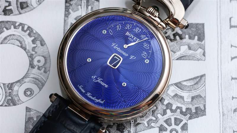 當佩戴在手腕上時,Virtuoso V 的尺寸和重量都不是問題——盡管這不是一款特別小或特別輕的手表(里面有很多黃金!)。藍色鱷魚皮表帶與表盤上的彩色“flinqué 琺瑯風格”雕刻和上漆工作相得益彰——其中一個表盤幾乎完全雕刻和上漆在這款稀有版本的腕表上。這個版本的 Virtuoso V 在審查時甚至沒有出現在播威網站上——其他版本(不同的表殼材料和可選的鉆石)在表盤的跳時指示器側具有不同的外觀。