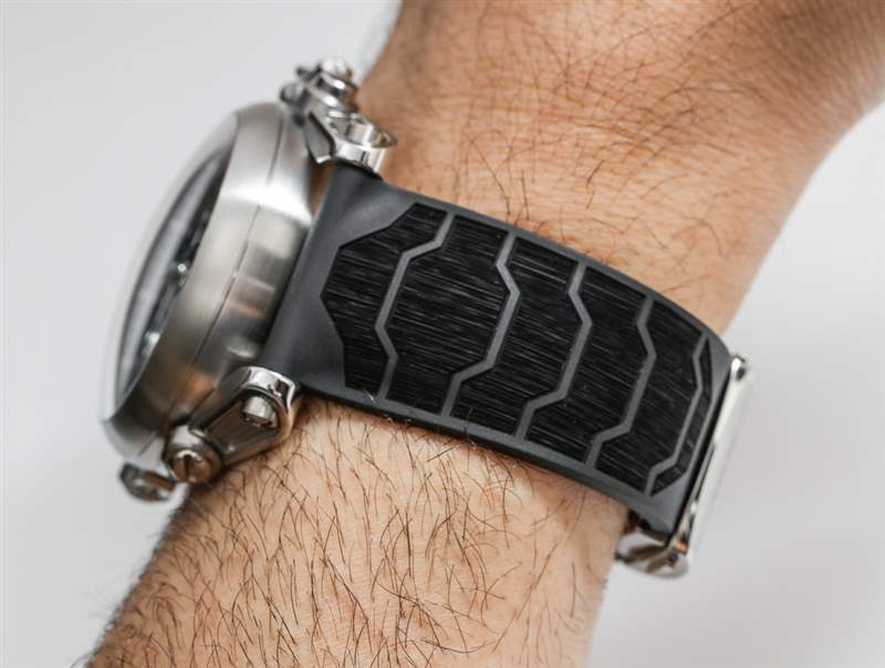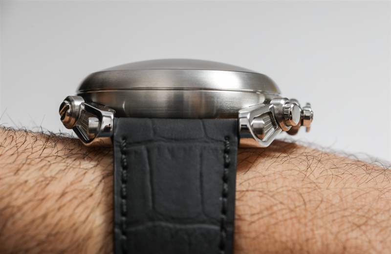 表殼本身是 44 毫米寬的鋼制。44 毫米是一個謙虛的術語,因為它只包括內殼,而不包括復雜的表耳結構,表殼右側與計時按鈕和表冠融為一體,共同將手表的寬度推至約 50 毫米寬。凸耳到凸耳的距離約為 52 毫米。內殼非常受 Ikepod 啟發,而表耳似乎暗示了一種更加機械和前衛的感覺。我認為這個元素很好地使 Chrono-Tour 設計看起來更加獨特,并有助于賦予手表更年輕、更陽剛的個性。有趣的是,這種表殼(也防水 100m)佩戴起來相當舒適。你確實需要它在手腕上相對舒適,但我很欣賞人體工程學,考慮到整體設計,這并不明顯。