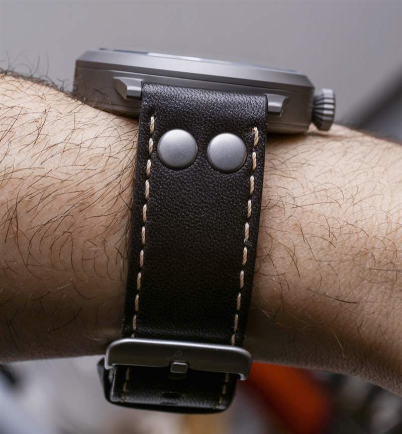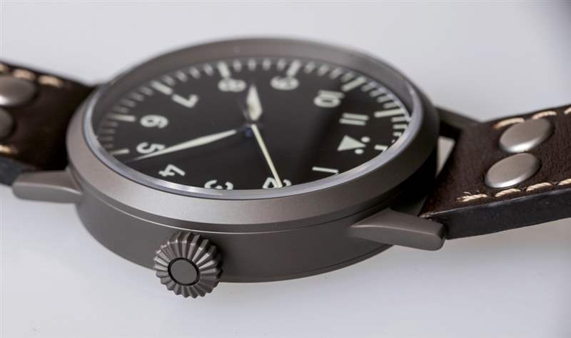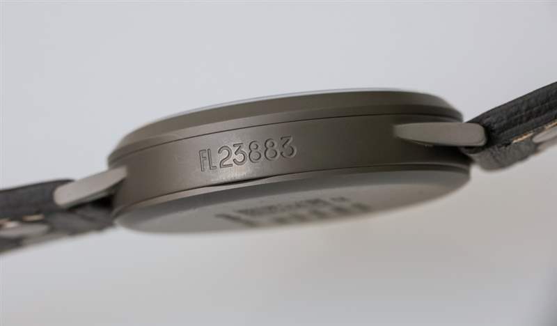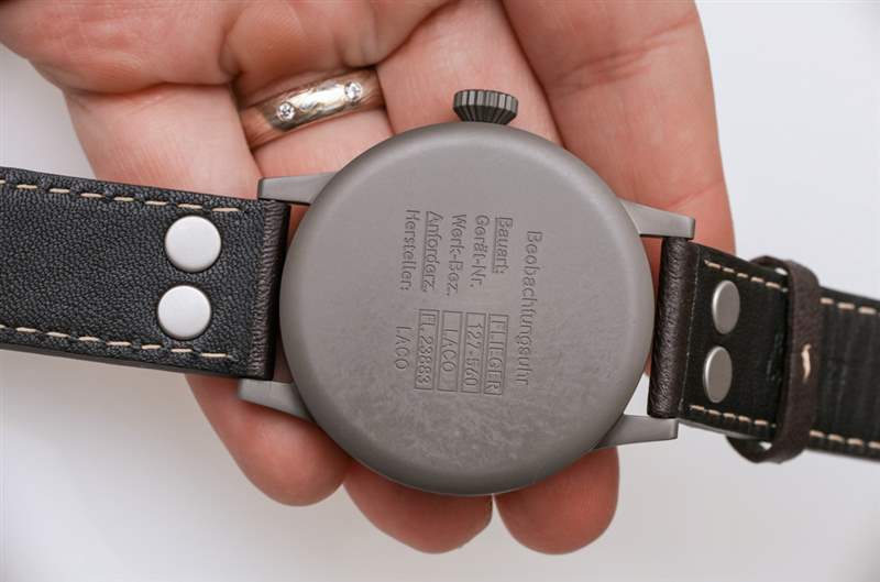 表耳寬 22 毫米,這意味著飛行員手表原版的 45 毫米寬版本有一個沉重的表帶。表殼厚度為13mm,還不錯。Laco 用棕色小牛皮表帶上的兩個鉚釘保持傳統外觀是正確的。它不是世界上最棒的表帶,但它確實感覺就像最初提供給軍事飛行員的手表一樣。手表背面是我認為收藏家會喜歡的功能。底蓋上印有軍用款式編號以及歷史悠久的“FL. 23883” 德國政府代號。非德語人士也可以嘗試發音“Beobachtungsuhr”,這也印在 Laco Pilots Watch Original 的背面。