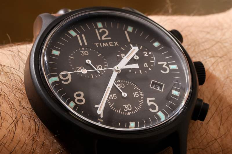 關于聲音滴答聲的說明,因為這個問題對我很敏感。Timex 和 Swatch 等其他一些專門生產易于制造、耐用的石英機芯的公司使用的零件可以發出由表殼材料和機芯材料引起的可聽見的滴答聲。Timex 的許多三指針 MK1 手表每秒鐘都會發出滴答聲 – 產生一些人喜歡的聲音效果,而另一些人則覺得會分散注意力。我個人不喜歡聽得見滴答聲的手表——尤其是當我在一個安靜的房間里并且沒有戴在桌子上滴答作響的手表時。這里要說的重要一點是,天美時的石英計時機芯,例如這款 MK1 Steel Chronograph 中使用的機芯,并沒有同樣響亮的滴答聲。我相信這是因為輔助秒針較小,因此,它在運動中的作用會減少噪音。因此,如果您是擔心石英表發出令人討厭的滴答聲的人,那么這款時計不是其中之一。