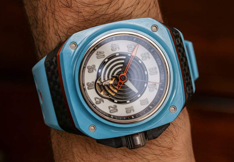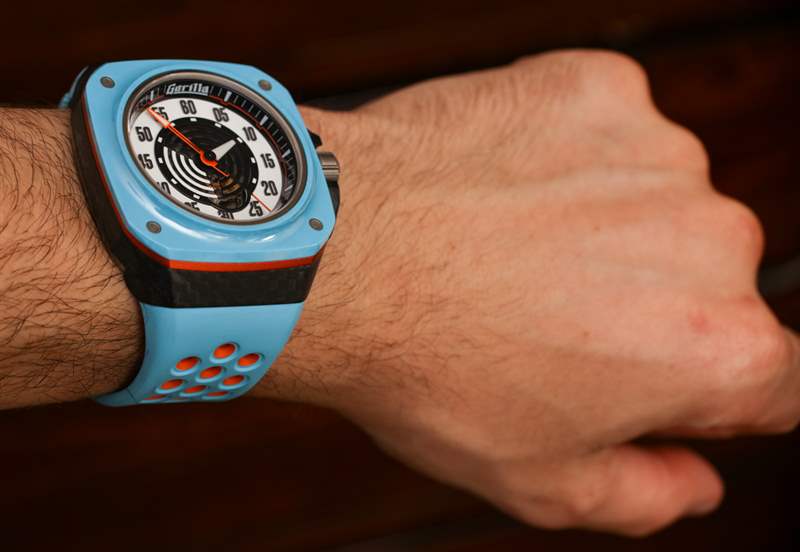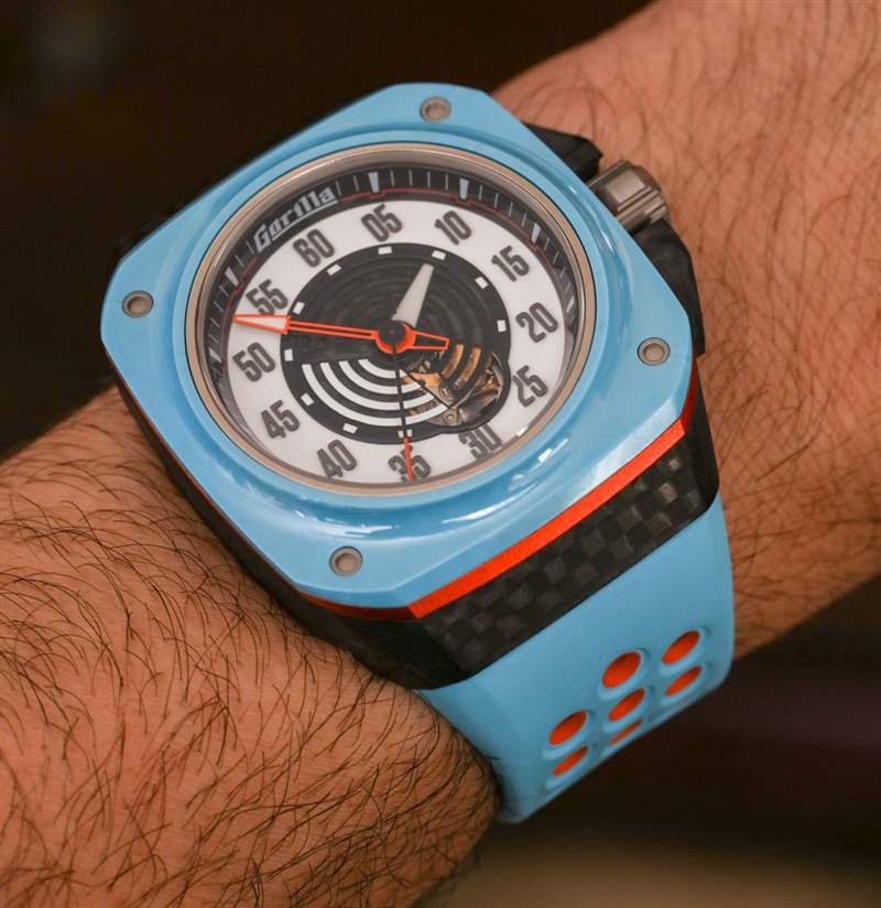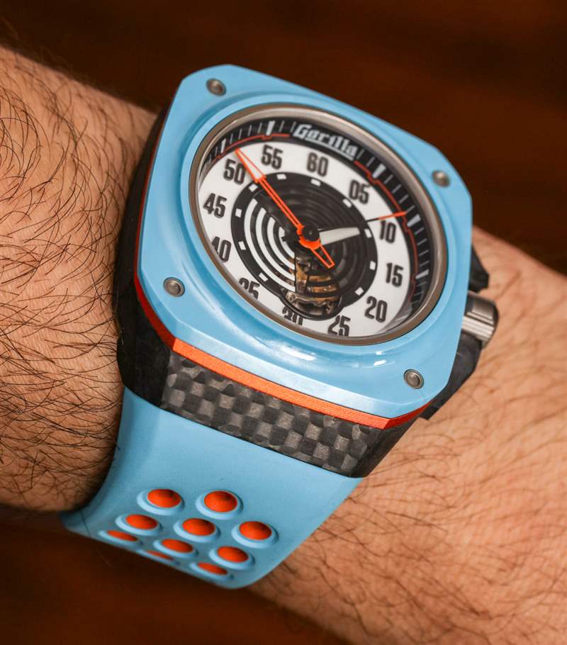 Fastback GT Mirage 表殼呈方形,寬 44 毫米(表冠寬 48.5 毫米),防水深度達(dá) 100 米。由于表殼形狀和寬肩帶,它穿得很大——但這就是 Gorilla 想要的外觀。我會(huì)爭(zhēng)辯說(shuō),盡管尺寸很大,但手表佩戴起來(lái)很舒服。對(duì)于 Mirage 版本的手表,Gorilla 繼續(xù)采用鍛造碳表殼,在此型號(hào)上,表耳結(jié)構(gòu)附近有一些碳纖維紋理(一個(gè)容易錯(cuò)過(guò)的細(xì)節(jié))。該表殼還使用鋼、鈦、陽(yáng)極氧化鋁作為表圈下方的橙色環(huán),以及用于表圈本身的陶瓷。這是我見(jiàn)過(guò)的少數(shù)幾款使用“粉藍(lán)色”陶瓷部件的手表之一——如今這仍然不常見(jiàn)。表盤上方是 AR 涂層藍(lán)寶石水晶。廣告訊息廣告信息結(jié)束