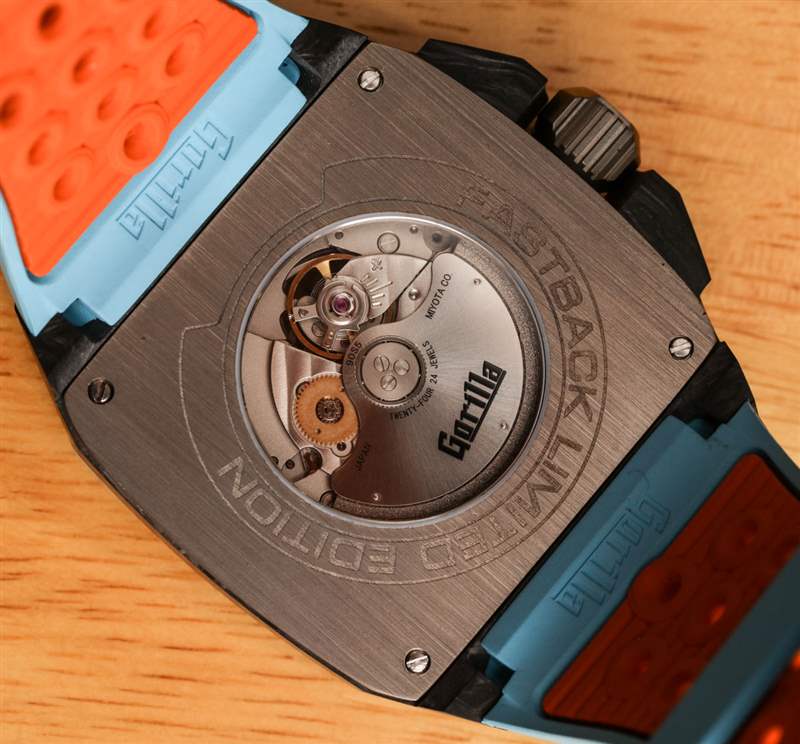 對(duì)于 Fastback GT Mirage,Gorilla 做了一些不同的事情,除了改變現(xiàn)有 Fackback 系列的顏色(沒(méi)有“GT”)。與 Fastback 相比,這款 Fastback GT Mirage 的主要區(qū)別在于升級(jí)的機(jī)芯(除了顏色)。Miyota 不再是 8XXX 系列日本 Miyota 機(jī)芯,而是來(lái)自 Miyota 9XXX 系列,在這種情況下是 Miyota 90S5 機(jī)芯。這款自動(dòng)機(jī)芯以 4 赫茲的頻率運(yùn)行,具有 48 小時(shí)的動(dòng)力儲(chǔ)存,并且通過(guò)手表的表盤可以看到外露的擒縱機(jī)構(gòu)。90S5在性能和外觀上都是升級(jí)版。您可以通過(guò)表殼背面的水晶窗看到機(jī)芯的其余部分。