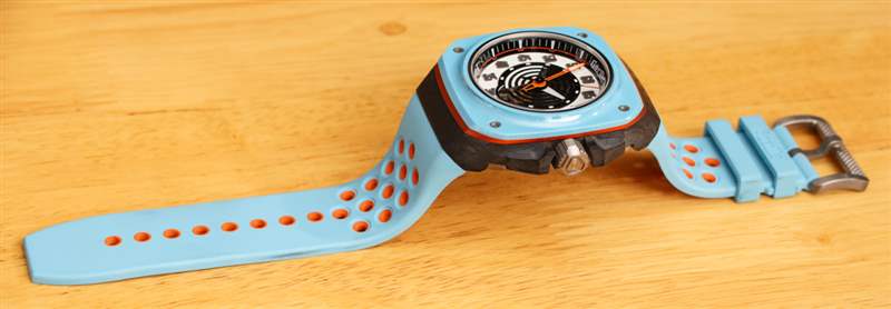 海灣石油/賽車藍(lán)和橙色主題的大部分體現(xiàn)在雙色橡膠表帶上,表帶外側(cè)為藍(lán)色,內(nèi)側(cè)為橙色。橙色可以通過(guò)表帶上的穿孔識(shí)別出來(lái),我認(rèn)為大猩猩在設(shè)計(jì)如何使用顏色方面做得很好。連接到表帶的是一個(gè)鈦扣。
