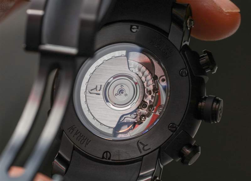 請(qǐng)注意,我拍攝的手表是預(yù)生產(chǎn)原型,零售型號(hào)會(huì)有所不同。將來我可能會(huì)查看 RJ Arraw 計(jì)時(shí)碼表,這樣我們就可以比較圖像并查看 RJ 做了哪些更改。看著手表的背面,我們看到一個(gè)藍(lán)寶石水晶展窗,展示著一種神秘的轉(zhuǎn)子,只有 RJ 標(biāo)志在旋轉(zhuǎn)。表殼防水深度達(dá) 100 米,并且鑒于突出的表耳結(jié)構(gòu),其磨損程度可想而知。RJ 有一些粉紅色和鉆石裝飾的 42 毫米寬版本的 Arraw 計(jì)時(shí)碼表,但很明顯,大多數(shù) 45 毫米或 42 毫米寬的手表都是打算戴在男性手腕上的。在我的手腕上是 45 毫米寬的版本,以防不清楚。